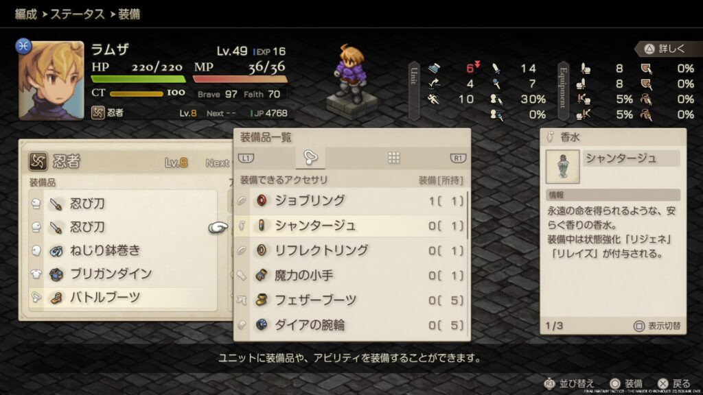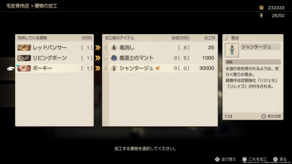 ポーキーを産ませてチャプター3で解放される毛皮骨肉店で永久リジェネとリレイズがついた香水シャンタージュを確保しました。