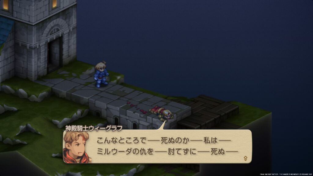 ウィーグラフは結構個人的になぜか思い入れがあり、それは当時のチャプター1でもチャプター3でも強敵として立ちはだかったのは勿論(ちなみに自分は詰んだことはありません)、ラムザにもディリータにもなれなかった兄という存在として印象に残っているわけですよ。