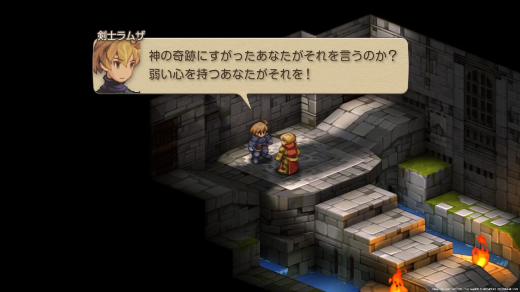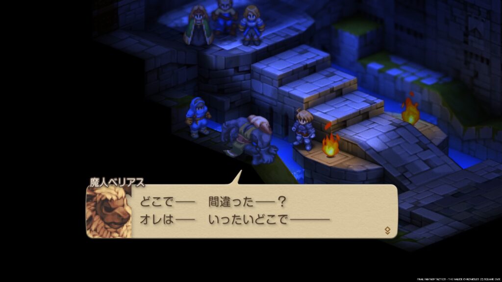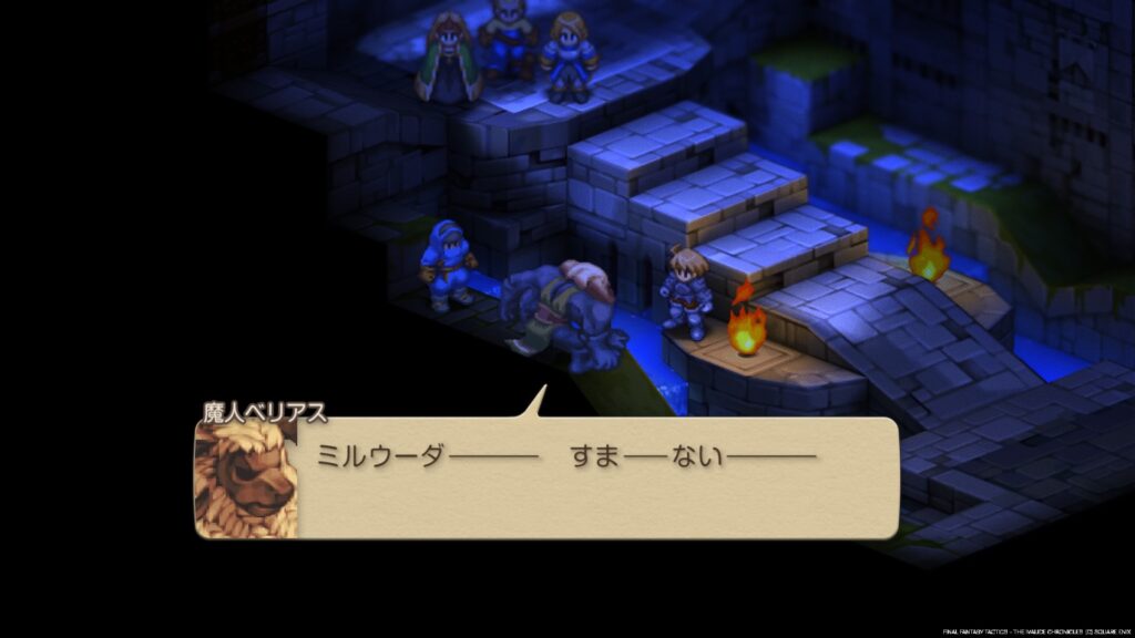 でも、ここのラムザとの論戦はチャプター1からの因縁と一度も同志として交わることはなかったですが、同じ兄として、また同じように民衆に寄り添おうとした男達の言葉のぶつかり合いがあり、これがあるからこそ人間同士の因縁はウィーグラフとの決着で終わってしまうと自分が感じる大きな要因なわけですね。