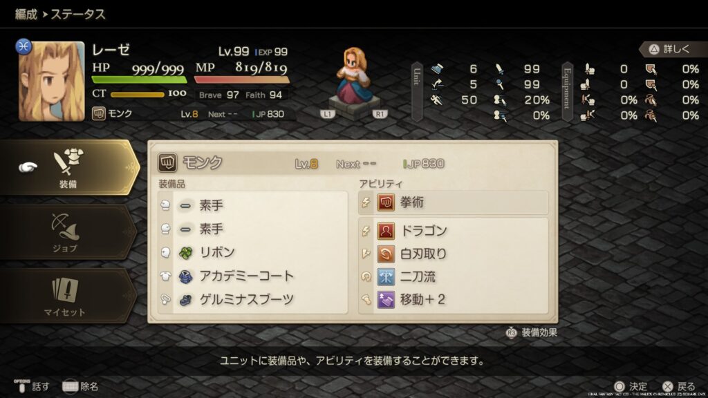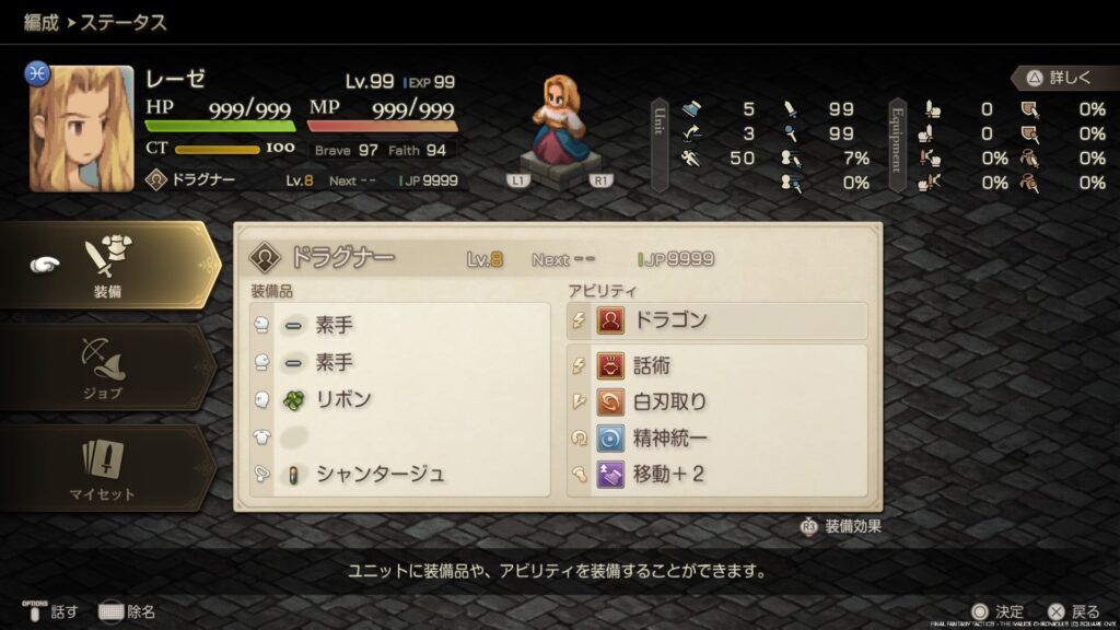 自分に限らずレーゼには殴りのイメージが強い人が多いでしょうから、最初はドラグナーに拳術セットを考えていたんですが、ドラグナーに拳術セットするより、モンクにドラゴンつける方が移動力と装備面で強いでしょ?ということで今回の盆栽では初めて固有ジョブ以外をメインにする形になりました。