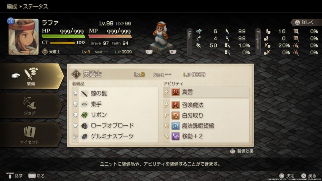 もう1つのアクションアビリティに関しては最初に言った通り、純魔法使いタイプは少ないので、隠し召喚獣的な位置付けのゾディアークが使える召喚魔法はラファにこそ相応しいと思い召喚魔法をチョイス。