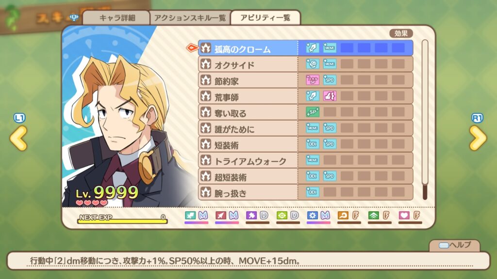 | 孤高のクローム | 行動中「2」dm移動につき、攻撃力+1%。 SP50%以上の時、MOVE+15dm。 |
