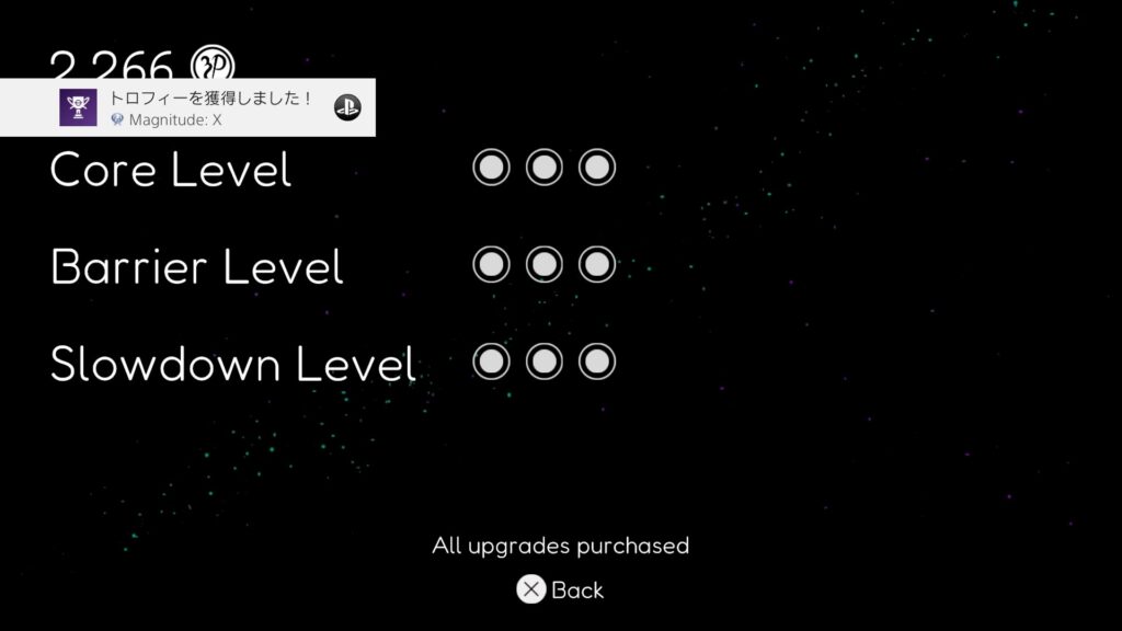 これを解除したら通過15000が貰え、それをアップグレード画面で3つ全ての項目のアップグレードに使えばFusion X+のトロフィーも解除してプラチナ取得して終了。