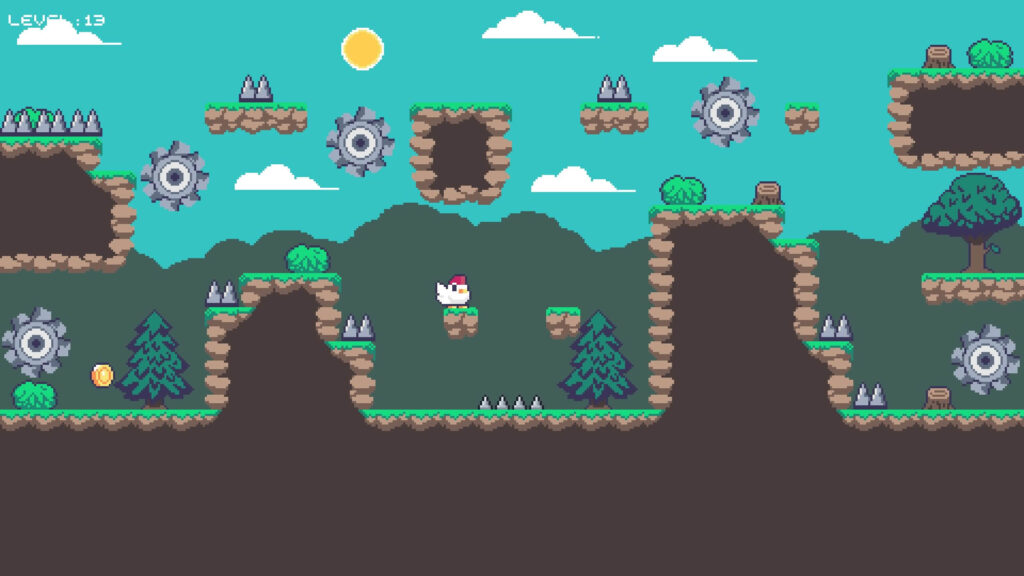 プレイヤーはニワトリを操作し、15 のコンパクトなステージに挑戦します。トゲや動くノコギリを避けながら、各ステージのコインをすべて集めましょう。ステージ構成はシンプルで、配置を覚えたりジャンプのタイミングを学んだりしやすく、プレッシャーなく遊べます。