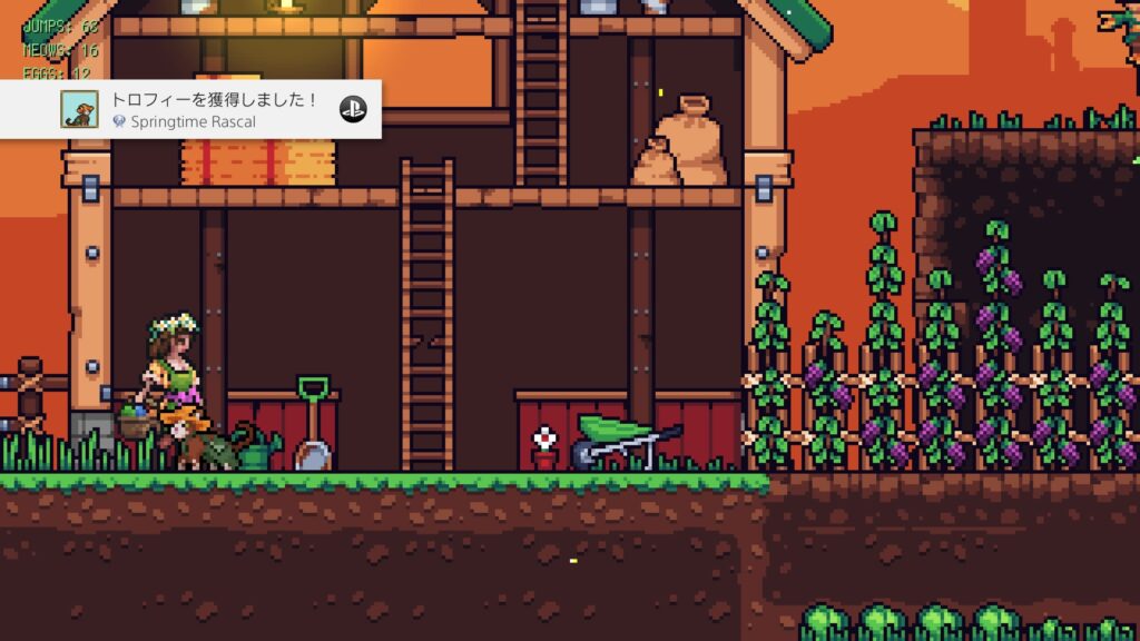 ジャンプ回数や鳴いた回数は始まってすぐにそれぞれ12回ボタン押すだけなので難しいところもなく。風車小屋の屋根に関してもそこに卵があるので、やはりついで取り可能で何一つ難しいところもなく簡単にプラチナ取れるはず。