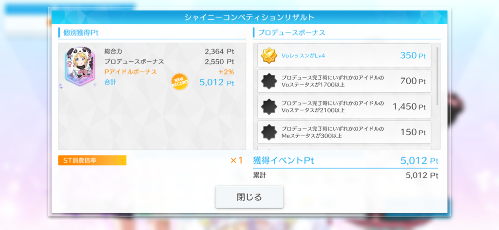 - プロデュース完了時にいずれかのアイドルのVoステータスが2100以上 1450Pt