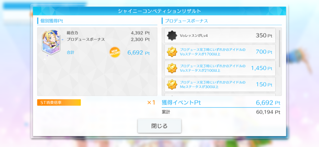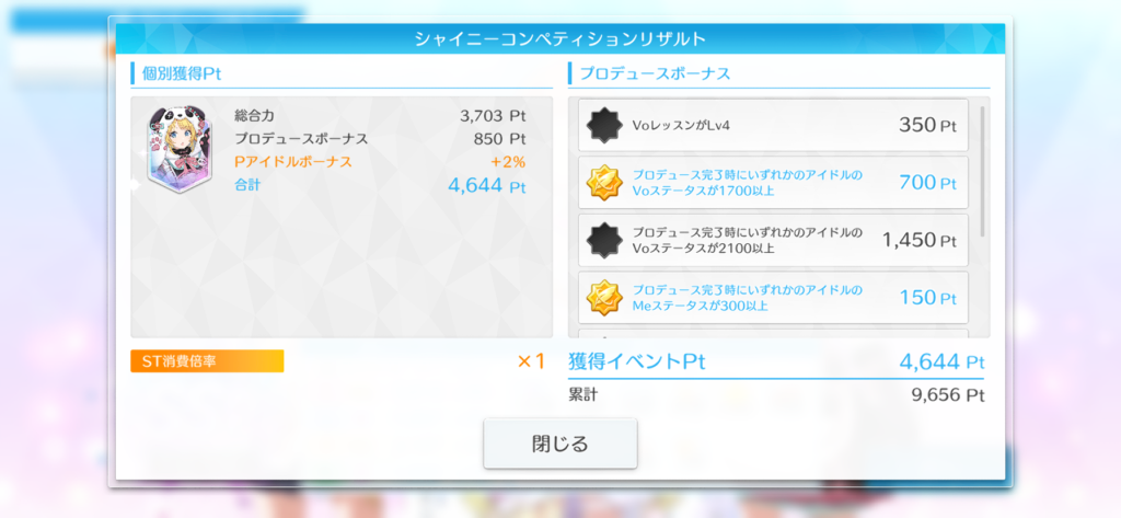 - プロデュース完了時にいずれかのアイドルのVoステータスが1700以上 700Pt