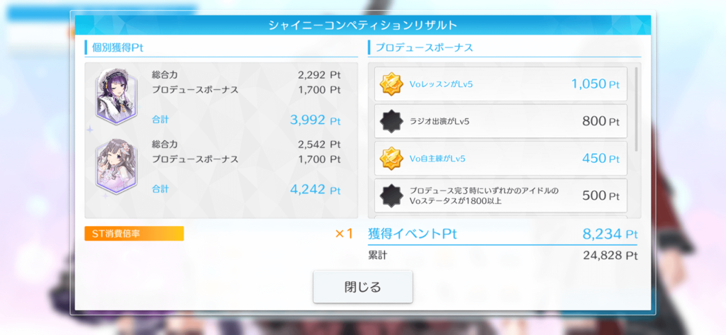 - プロデュース完了時にいずれかのアイドルのVoステータスが1800以上 500Pt
