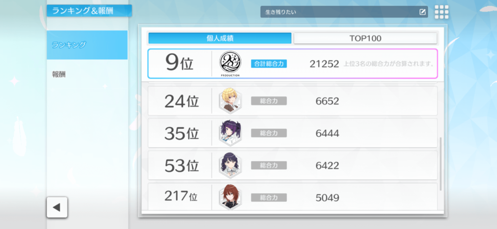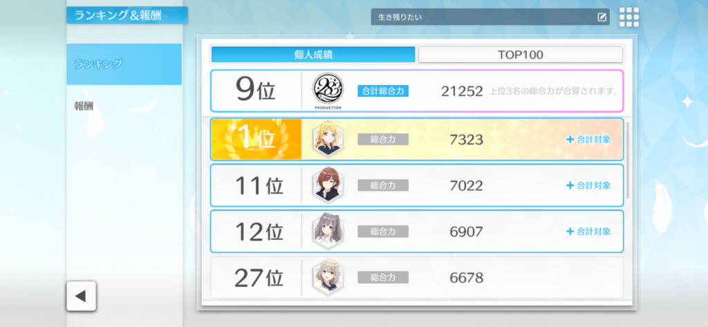 円香と霧子は称号的には惜しかったですが、時間的にはしゃあなかったですね。ただ総合順位にはめちゃくちゃ貢献してくれたので感謝しています。リフラクションズユニットアイドルはこういう時に明確に強いですね。