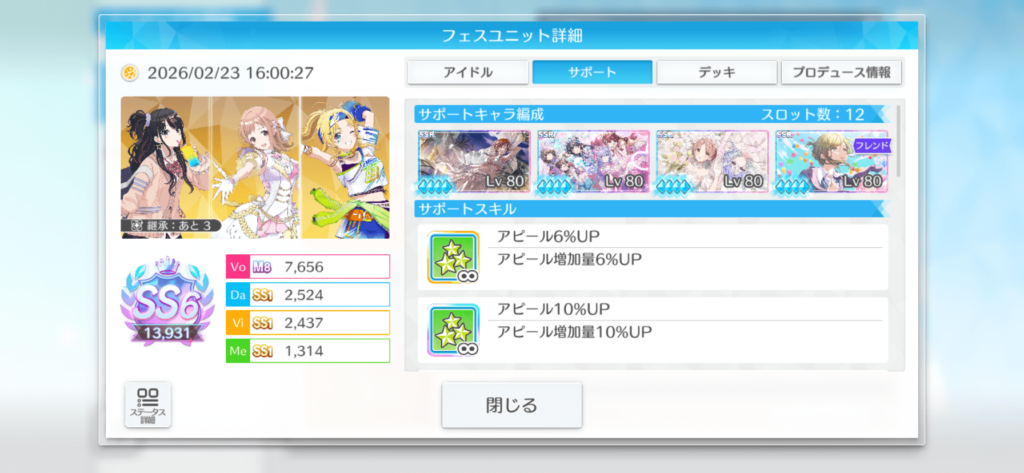 で、このサポートのメンバーを見ても分かる通り、今回は美琴、ルカは使えないサポートがいるので結構向かい風だったという結果。だからこそ自分は妥協ラインにこの2人を持ってきて、全員使える他のアイドルはVo2100狙って全員無事に100位以内に入れたという結果にしました。