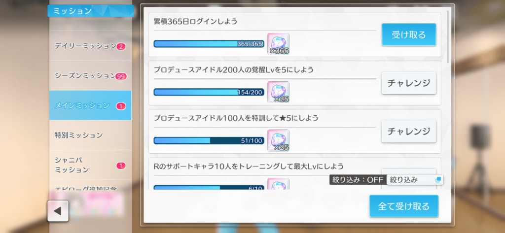 音ゲー自体は殆どやったことなく、スマホの音ゲーは初めてという完全な素人。それでも何とかミッションをクリアしようとアイドルのスキルや曲の難易度なんかを考慮しながら何とか28人分達成していました。