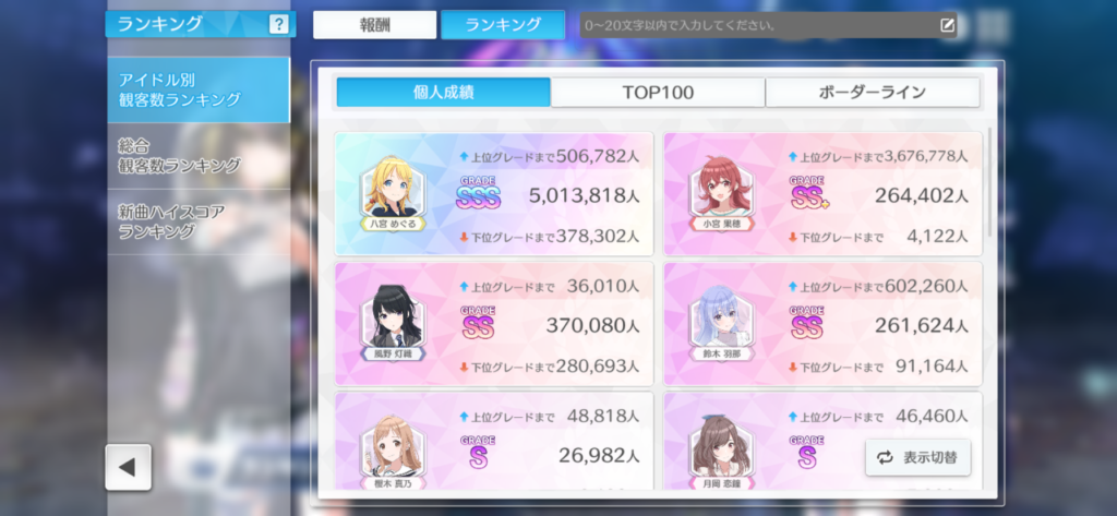 凛世とか羽那とか100位ボーダーが跳ね上がっているとそこから更に厳しくといったところでしょうか。