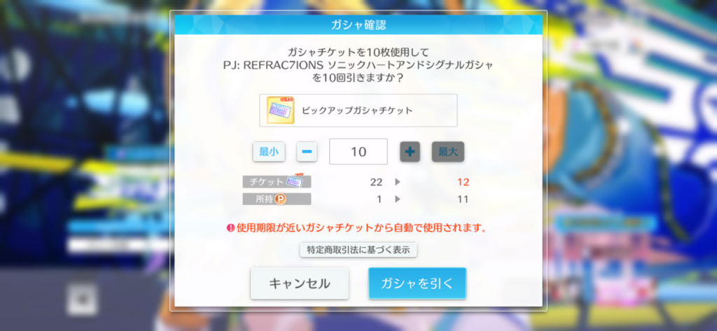 今自分が持っているガシャチケで次のガシャまでに期限が持たないのは10枚。ありがたいことにここで10連分引けてしまいます。