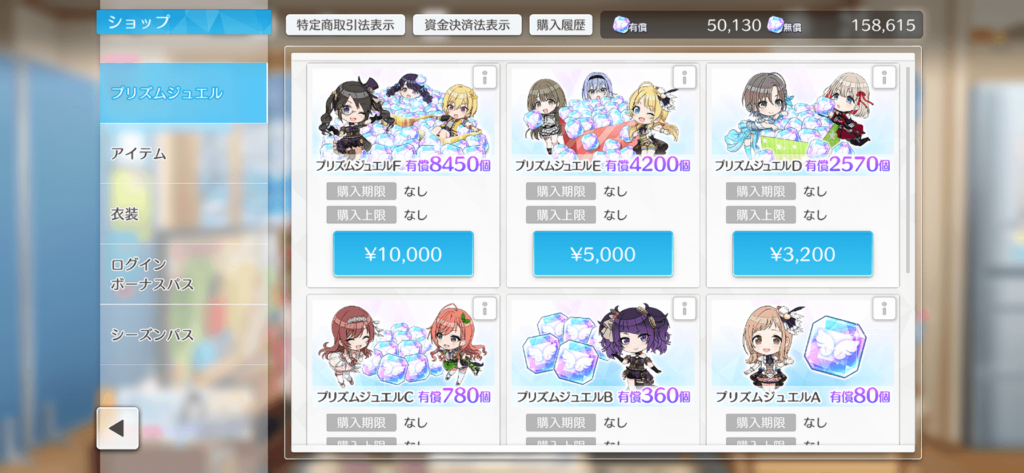その数無償ジュエル158615、有償ジュエル50130。