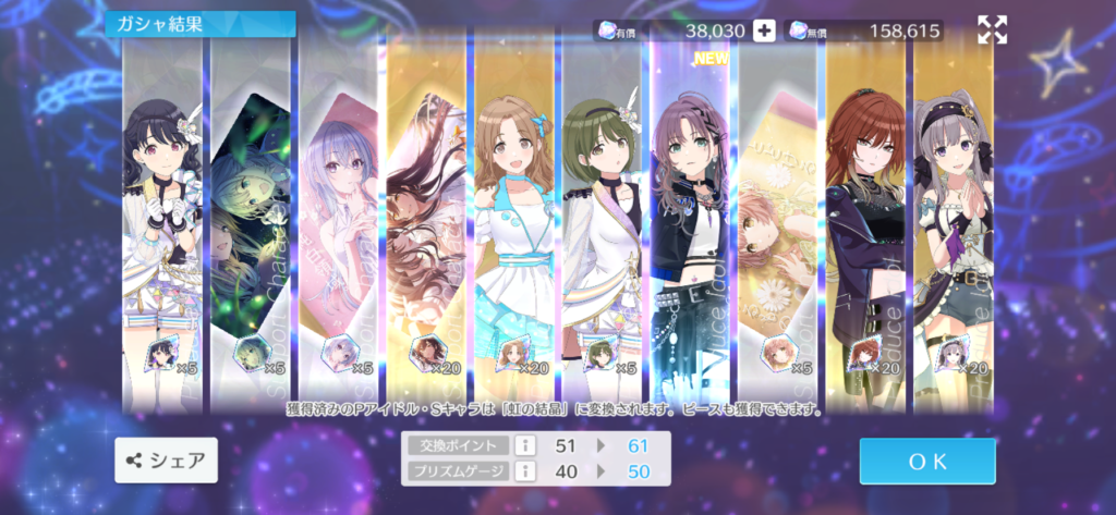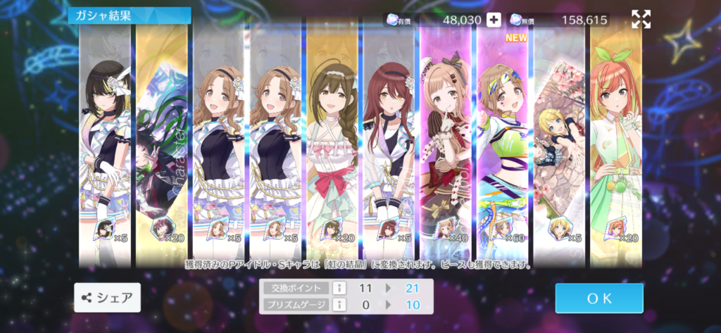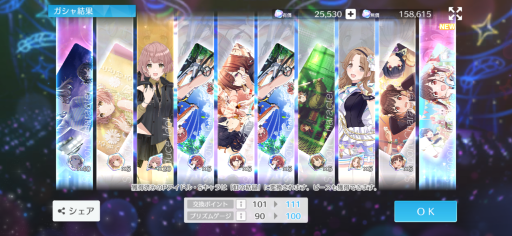 はい、幸先良くチケット10枚だけでまずは恋鐘をゲット。ついでに灯織もいるので虹の結晶もうめぇと来たもんだ。