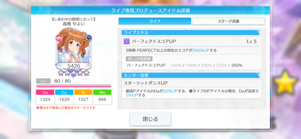 スコアを出すならド安定のライブスキルの1つで優秀。センター効果もスターリットダンスUPで同時実装の【リボンに結ぶ、大きな気持ち】の方のやよいの完全上位互換のセンター効果となっています。